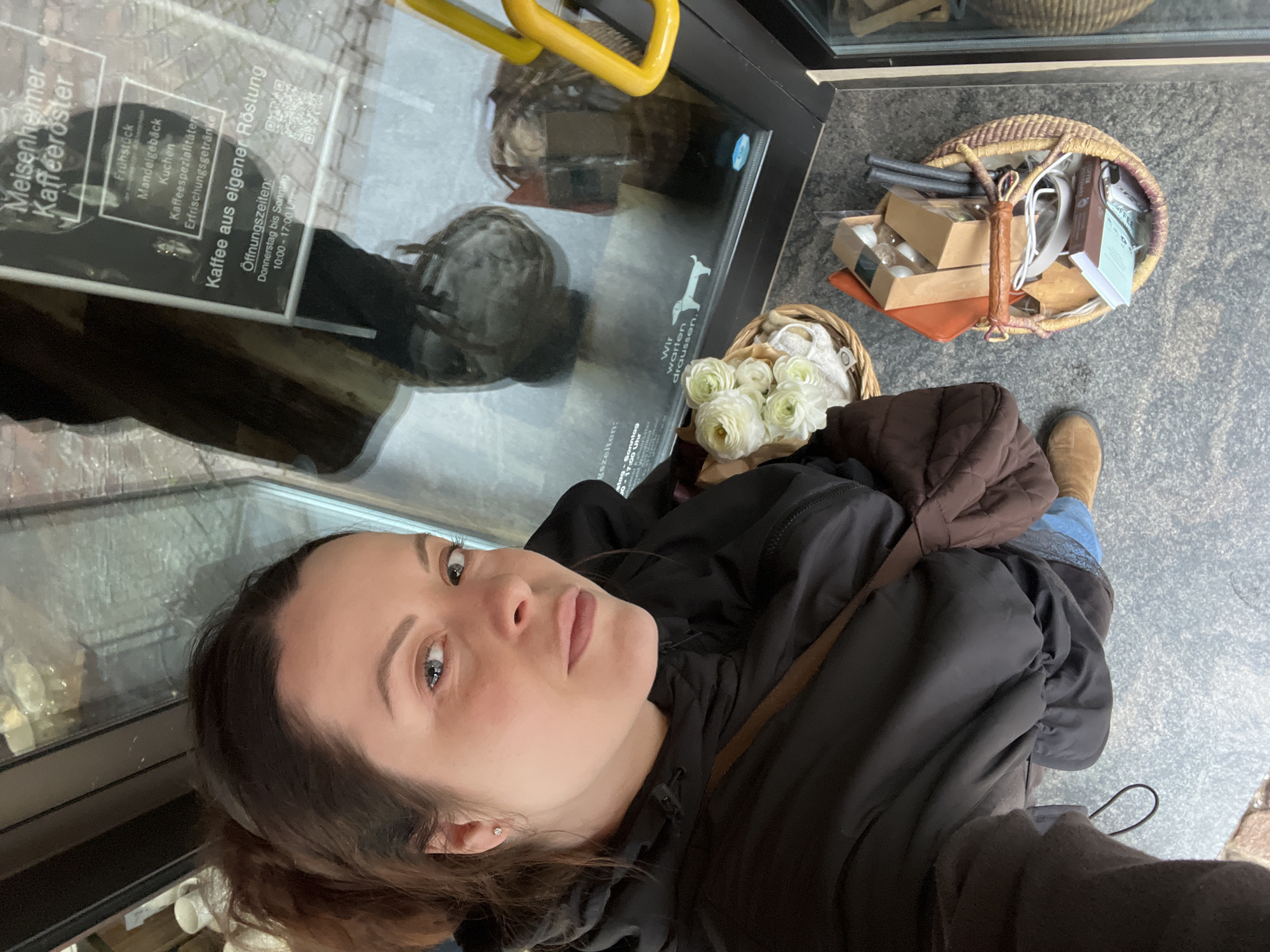 An adult female is depicted taking a selfie photograph, positioned outdoors in front of the "Meisenheimer Kaffeeröster" establishment in Meisenheim, Germany