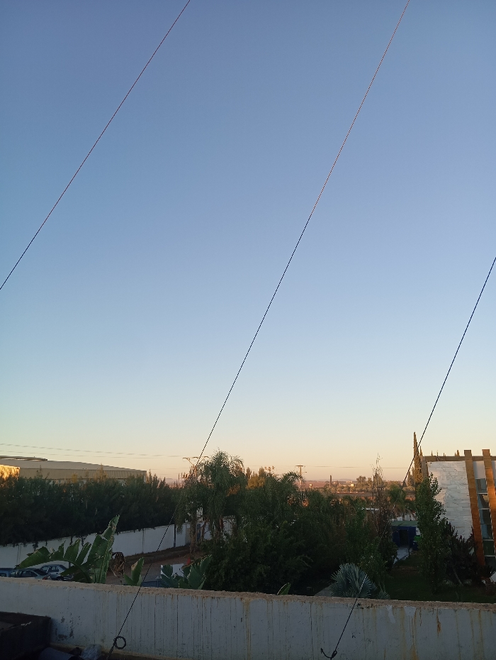 A view from a rooftop reveals a cityscape at sunrise or sunset. Lush greenery, including trees and shrubs, fills the middle ground. A low wall with visible wear forms the foreground. In the distance, buildings and utility poles dot the horizon, framed by a soft gradient sky of pale blue and orange hues. Overhead, electrical wires stretch across the scene.