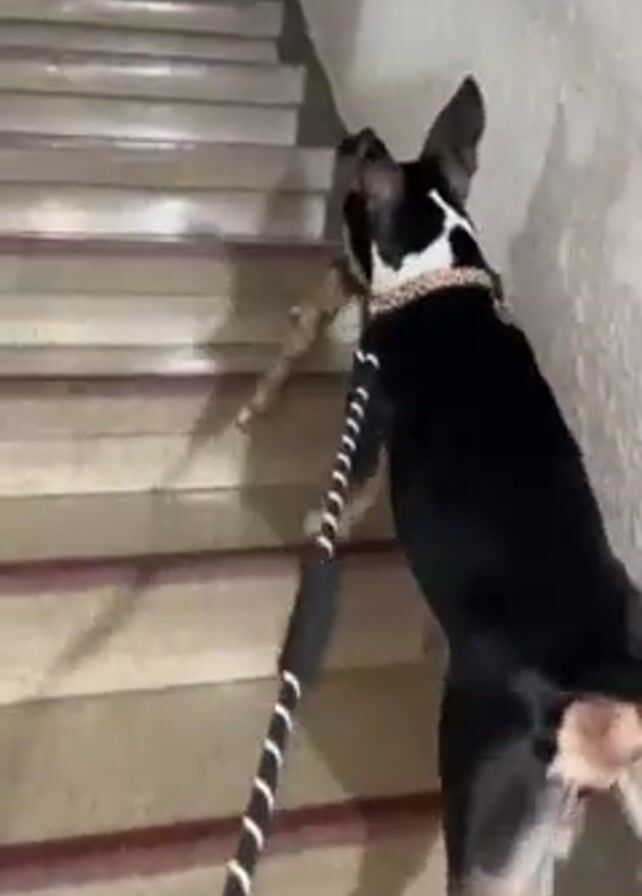 A black and white dog with a toy in its mouth walks up a staircase. The dog is on a leash and has a gold collar. The staircase is light gray with a red trim along the edge of each step. A Santa Claus decoration is on the wall next to the door at the top of the stairs.