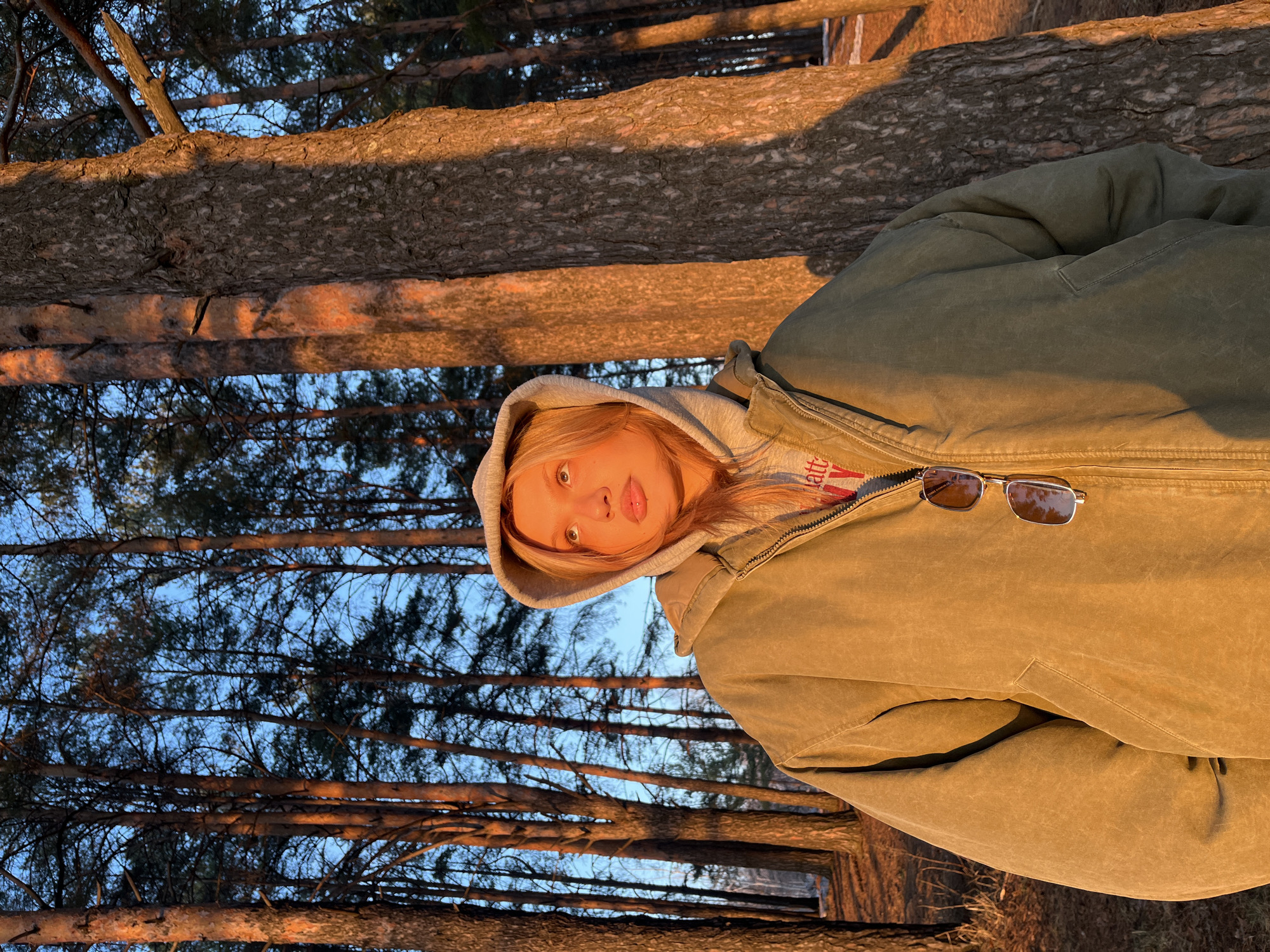 A medium shot depicts a person with fair skin and blonde hair, wearing a grey hooded sweatshirt under an olive-green jacket, positioned in a wooded area. The jacket has sunglasses perched on it. The background is filled with pine trees reaching towards a blue and cloudy sky, suggesting a forest environment. The scene's lighting indicates either sunrise or sunset. Based on the provided location information, this image was taken in or near Chaikovsky, Russia.