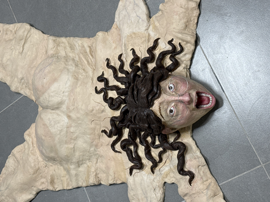 A peculiar art piece depicts a skin rug with protruding breasts and a sculpted head with curly hair