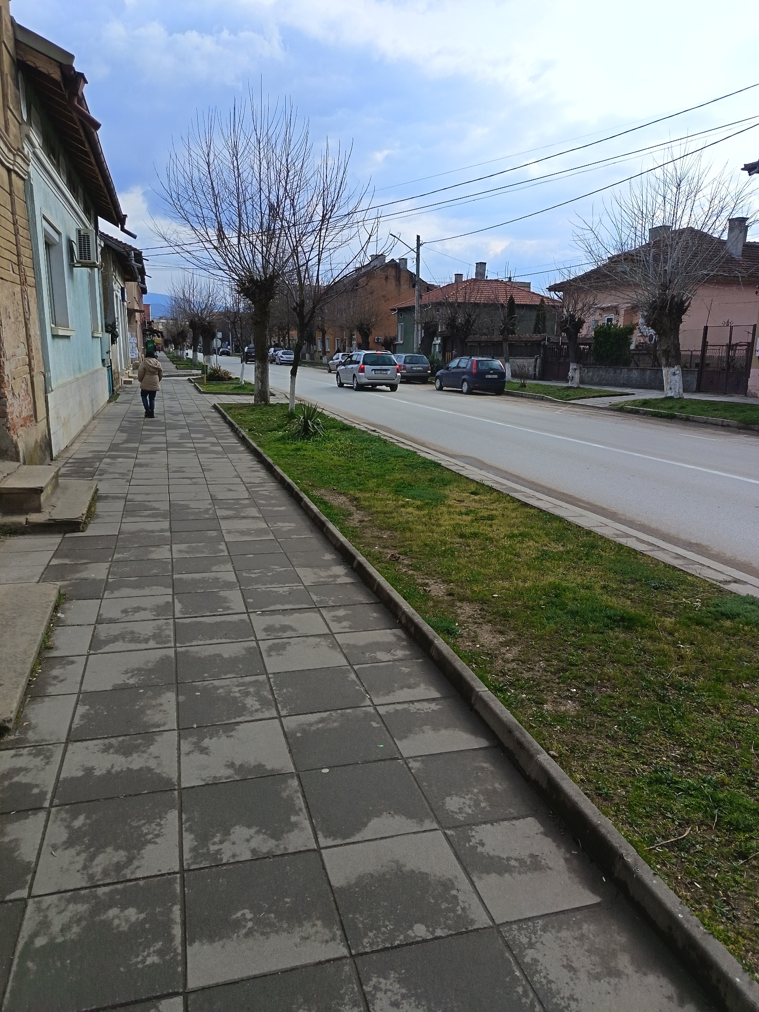 The image depicts a street scene in the city of Roman, Bulgaria, under a partly cloudy sky. The perspective is from a tiled sidewalk in the foreground, looking down the street. **Environment:** The foreground features a pedestrian sidewalk composed of grey square paving slabs, many of which exhibit darker, irregular patches indicative of dampness or recent wetness. To the right of the sidewalk is a narrow, unkempt grass verge with some visible patches of bare earth and small green foliage, bordered by a concrete curb. Adjacent to the grass verge is an asphalt road with a single solid white line marking its center. Overhead utility lines are visible against the sky. Distant mountains or hills are faintly visible on the horizon. **Subjects and Objects:** * **People:** A single individual is present on the sidewalk in the mid-ground, viewed from behind, walking away from the camera. This person wears a light tan or beige jacket and dark trousers. * **Vehicles:** Multiple vehicles are present. A silver station wagon is partially visible parked on the right side of the road with a Bulgarian license plate (CA 6061 HA). Further down on the left side of the road, a dark blue hatchback or small station wagon is parked, bearing a Bulgarian license plate (BP 0858 EX). Additional cars are parked further along the street in the distance. * **Buildings:** Residential buildings line both sides of the street. On the left, the closest building features a light blue painted facade, a brick base, two white-framed windows, and an external air conditioning unit. Further buildings on the left show various colors and designs. On the right side of the road, houses with light pink and darker facades are visible, all featuring red-tiled roofs and chimneys. Some houses have fences in front of them. * **Vegetation:** Numerous deciduous trees with bare branches line the street, indicating a season other than summer. Some tree trunks are whitewashed near their bases. Small, dark green shrubs are present in the grass verge. * **Sky:** The sky is characterized by a mix of light blue areas and white cumulus clouds.