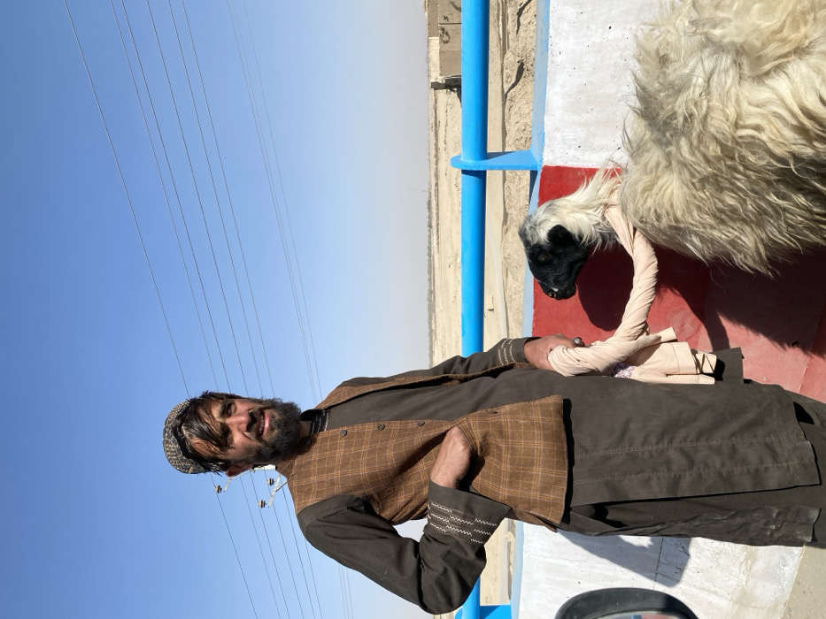 The scene, located in Mandisar, Afghanistan, depicts an adult male and a sheep outdoors under a clear blue sky