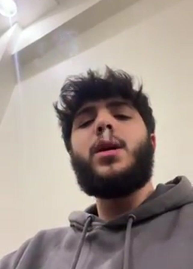 A man with a dark beard and dark curly hair exhales smoke from his mouth toward the camera