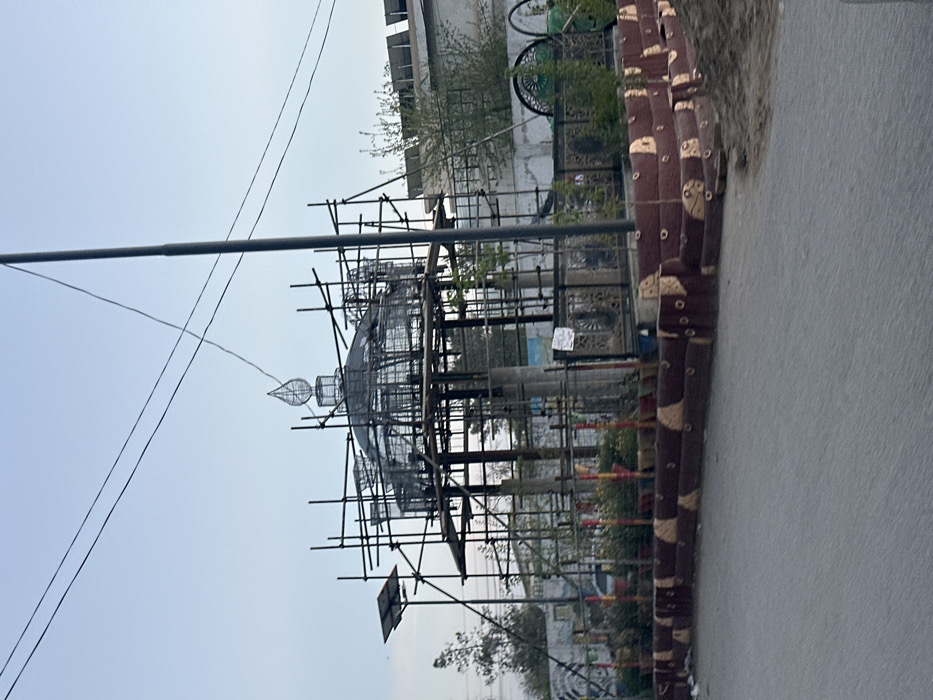 In Quetta City Tehsil, Pakistan, a large, intricate metal framework structure is positioned centrally, surrounded by extensive scaffolding, indicating ongoing construction or renovation