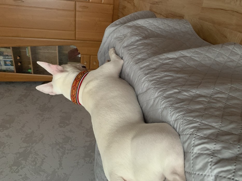 - "A white Bull Terrier dog with a distinctive red, white, and gold patterned collar is positioned prone on a gray quilted bedspread, facing away from the camera" by FM-RWjjF2, licensed under CC BY 4.0