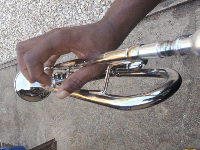 An overhead view depicts a dark-skinned human hand holding a silver-colored trumpet outdoors in Gwong, Nigeria