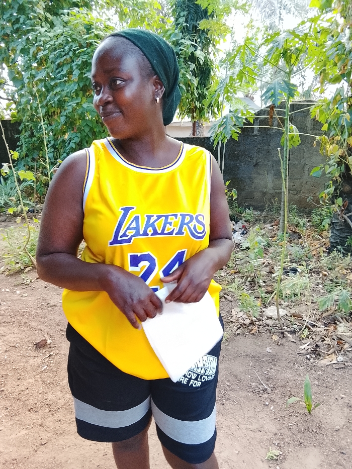 An adult female is depicted standing outdoors on reddish-brown earth in Akwanga, Nigeria. She wears a dark green headscarf, small hoop earrings, a yellow Los Angeles Lakers jersey with "LAKERS" and the number "24" printed in purple, and black shorts with two grey horizontal stripes on each leg. Her hands are clasped in front of her, holding a small white rectangular object. She looks towards her left with a slight smile. The background consists of dense green foliage, including a prominent papaya tree, a visible section of a concrete block wall, and various smaller plants and debris. Natural daylight illuminates the scene.