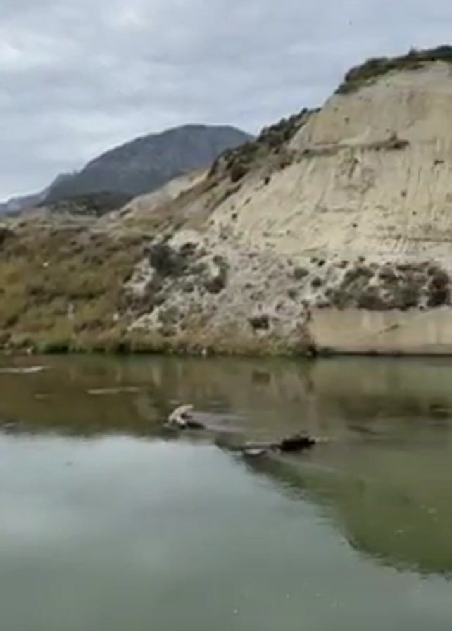 scenic view of a mountainous landscape with a body of water. The camera pans from the still surface of the water towards a man-made dam. Water flows over the dam, creating a small waterfall that cascades into a rocky, tree-lined area below. The sky is overcast.