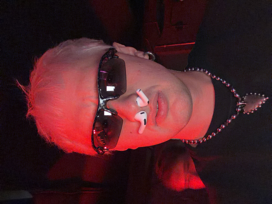 A fair-skinned person with platinum blonde hair poses in sunglasses, two AirPods, and a silver beaded necklace with a leaf-shaped pendant. The person is facing slightly towards the camera with a stoic expression. The lighting is red, casting a reddish hue over the scene. The background is dark and indistinct. The person's head is angled to the left.