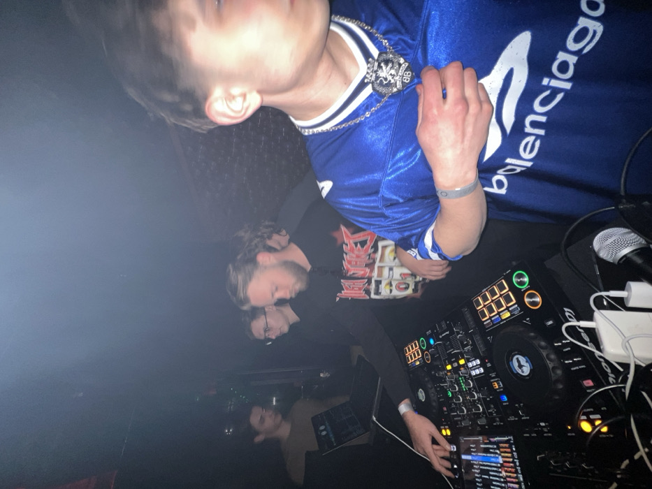 A blue Balenciaga-branded jersey is worn by a light-skinned individual, adorned with a necklace and bracelet. A bearded man wearing glasses and a black graphic tee stands nearby. A DJ console with multiple knobs, buttons, and screens sits prominently. A microphone is also present on the console. Another person is seen in the background with a laptop. The photo appears to be taken at an angle and in low light with some fog effects.