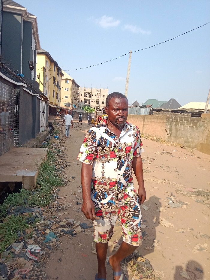 A man stands in a dirt road. He is wearing a matching patterned shirt and shorts. In the background, other people walk along the road and buildings are visible. There is trash strewn along the side of the road. He appears to be wearing sandals.
