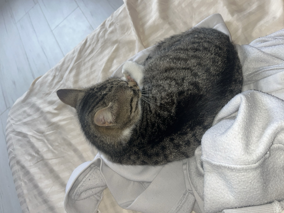 Within an indoor environment in the city of Smyadovo, Bulgaria, a domestic cat is depicted resting. The animal, exhibiting a brown and grey tabby coat with distinct darker stripes, is curled tightly into an ovular form, its head tucked against its chest. A white-furred paw is visible near its face, partially obscured by its position. The cat is positioned atop a crumpled, light-grey or white hooded garment, likely a sweatshirt, characterized by a fleecy texture. This garment rests on a light-beige or cream-colored sheet or bedding, which displays minor folds. A segment of light-toned flooring, possibly wood or laminate, is visible in the upper right background. No other individuals or active interactions are present in the frame. The lighting is ambient and appears consistent with an indoor setting.