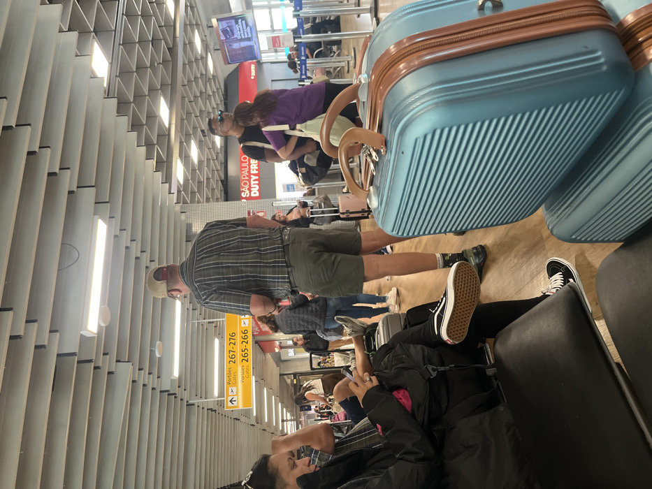 This image depicts an active passenger waiting area within an airport terminal in Guarulhos, Brazil, indicated by overhead signs in Portuguese "Portões Gates" and "SAO PAULO DUTY FREE". The scene is well-lit with overhead linear fluorescent lights and features a multi-layered suspended ceiling system. The floor is light-colored and reflective. In the immediate foreground, to the left, a person is seated on black modular airport seating. They wear a dark jacket and black pants/leggings, with black Vans Old Skool sneakers on their feet. Their right hand holds a smartphone, which they are observing. Another foot, clad in a grey athletic shoe, is visible further left, possibly belonging to a companion or the same individual with legs crossed. To the right in the foreground, two stacked, light blue hard-shell suitcases with horizontal ridging are prominent. These suitcases feature brown accent zippers and handles. In the mid-ground, a male individual stands with his back mostly to the viewer, positioned slightly off-center. He wears a plaid short-sleeved shirt, olive green shorts, a beige baseball cap, glasses, and patterned socks with dark slip-on shoes. He appears to be observing the area to his right. Further into the mid-ground, to the right, a male subject in sunglasses and a black t-shirt is conversing with a female subject who wears a purple t-shirt and carries a light-colored shoulder bag. Both are standing near what appears to be a "SAO PAULO DUTY FREE" sign. A digital display screen is visible beyond them. In the background, other passengers are visible, some standing, some seated, and various pieces of luggage are scattered throughout the terminal space, indicating a typical airport waiting area. Yellow overhead signage indicates gates "267-276" and "265-266" with directional arrows.