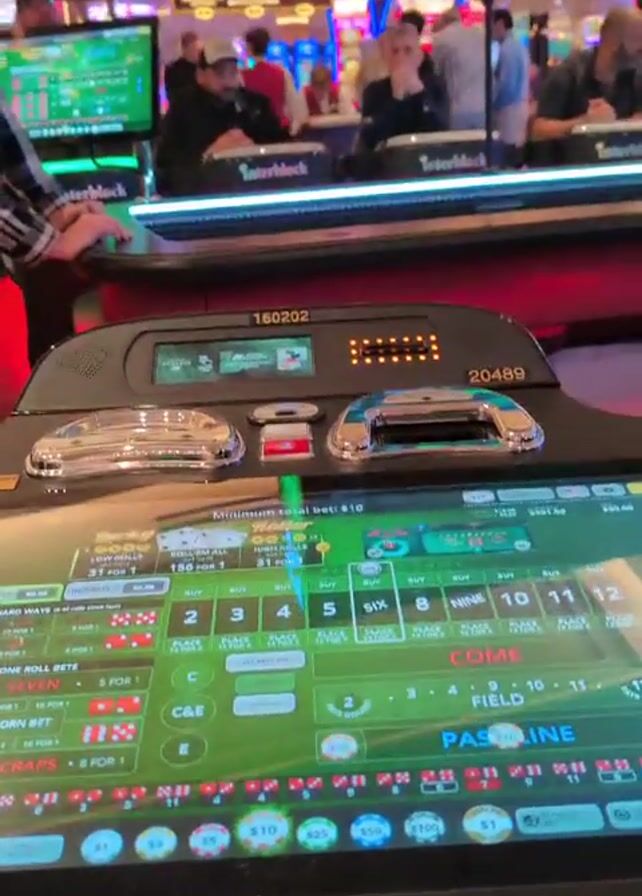 person standing at a virtual craps table in a casino. The table has a digital display showing the betting layout and current game information. Several people are sitting at the table, some are looking at their phones while others are observing the game. Above the table is a large display showing odds and messages like "GOOD LUCK." The casino environment includes slot machines, security cameras, and decorative lighting on the ceiling. A person wearing a plaid shirt and red pants is standing near the craps table.