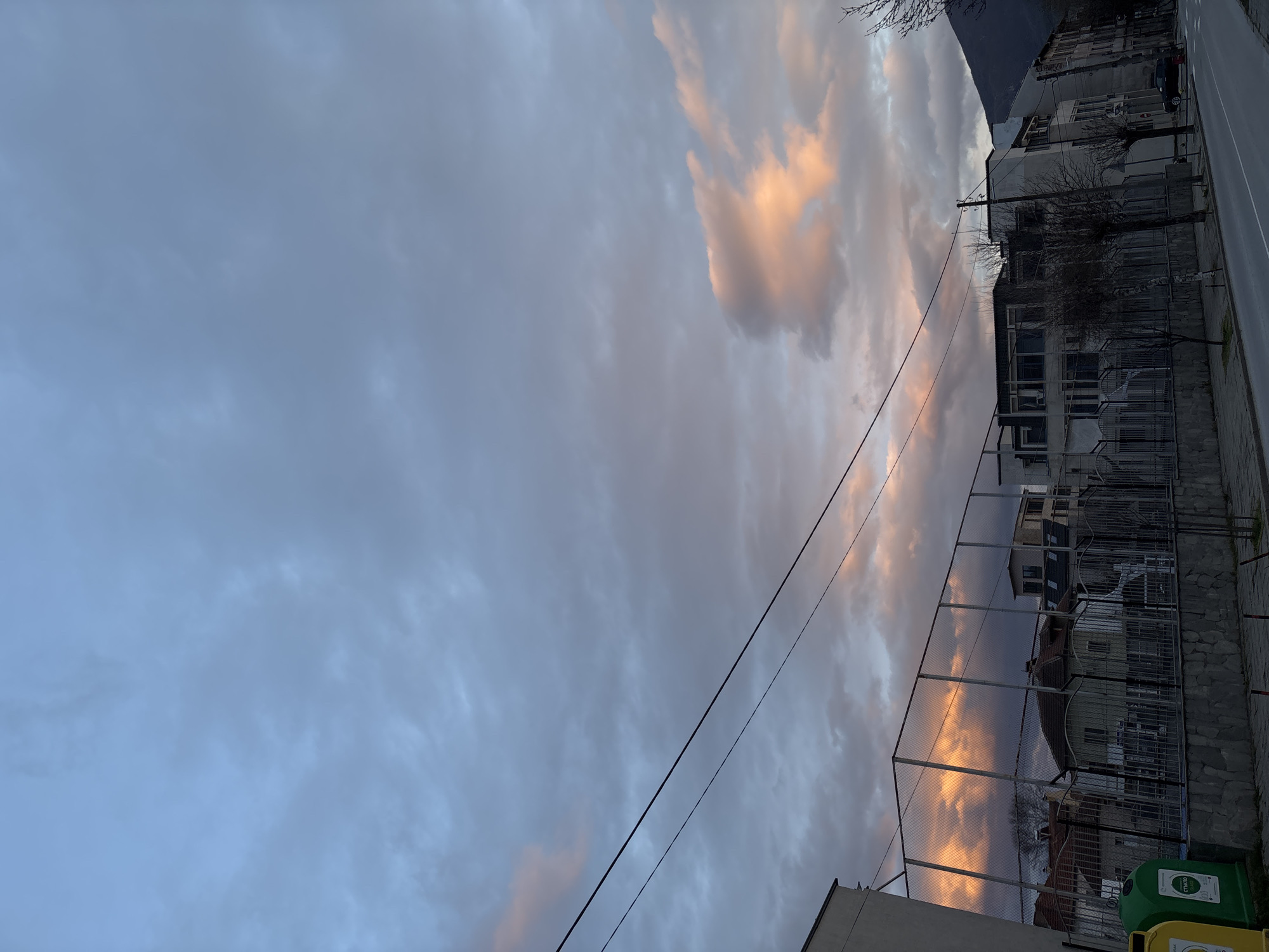 street scene in Goce Delchev, Bulgaria, at dusk. The sky is filled with grey clouds tinged with orange from the setting sun. A row of buildings lines the right side of the frame, obscured by a wire fence. A road runs alongside the buildings. Power lines stretch across the sky. In the foreground, there are recycling bins.