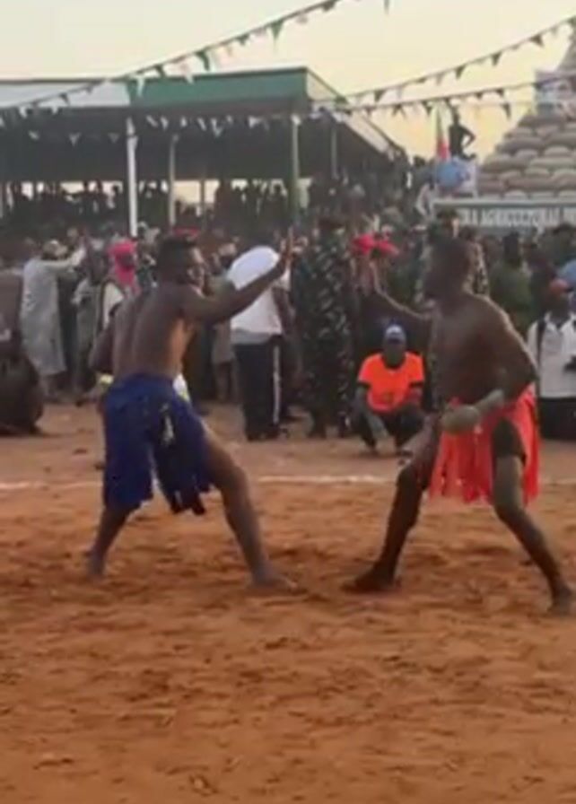 Two bare-chested men face each other in a sandy arena, wearing short cloths in blue and orange respectively. They are surrounded by a large crowd of spectators. One man extends his left hand towards the other. The arena is marked by green and white flags. There's a green-roofed structure behind the crowd. A stack of bags is visible in the background. The lighting suggests it is late afternoon or early morning.