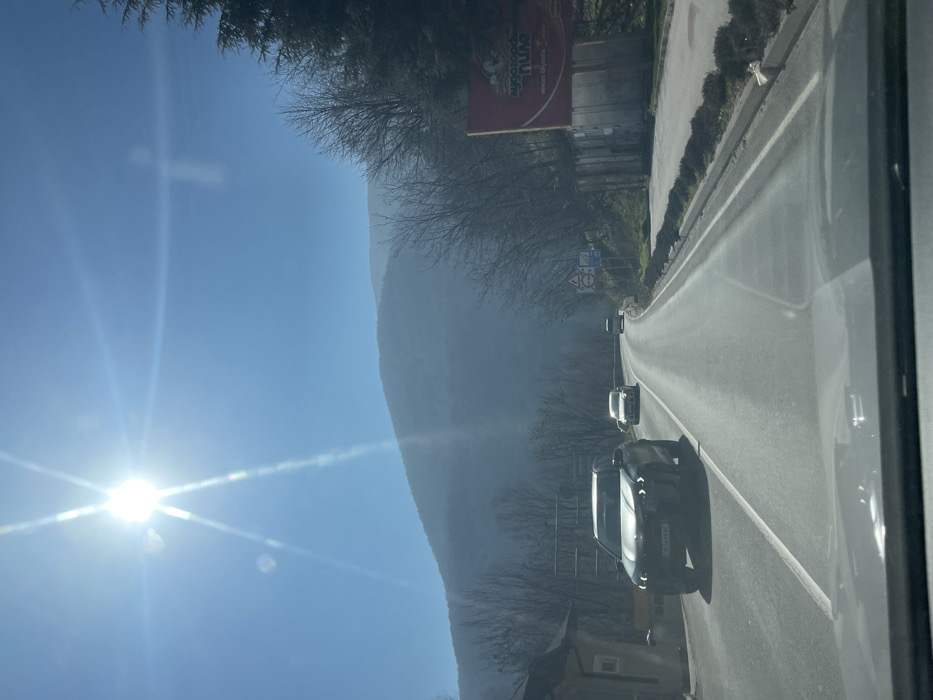 The image depicts a rural road scene in Vetren Dol, Bulgaria, captured from the interior of a vehicle, evidenced by the dashboard reflection in the lower foreground. The sky is bright blue with a prominent, glaring sun positioned high, causing lens flare and reflections on the road surface. In the mid-ground, a dark-colored SUV with visible front headlights is traveling toward the viewer on the right side of the road, displaying a Bulgarian license plate "CB 9789 MH." Further down the two-lane asphalt road, which features solid white dividing lines, at least three additional vehicles are visible in the distance, also traveling towards the camera. The environment is characterized by large, hazy mountains in the background. Bare deciduous trees line both sides of the road, suggesting winter or early spring conditions, interspersed with some evergreen trees on the right. On the right side of the road, a large red billboard with white Cyrillic text is present, partially obscured by trees. Below the billboard, a concrete structure or building is visible. A cluster of standard Bulgarian road signs, including triangular warning signs and circular regulatory signs, are posted on the right shoulder, beyond the bare trees. On the left side of the road, a small, light-colored building with a dark roof is partially visible, behind which a metal scaffolding-like structure can be seen. No individuals are discernibly visible in the frame.