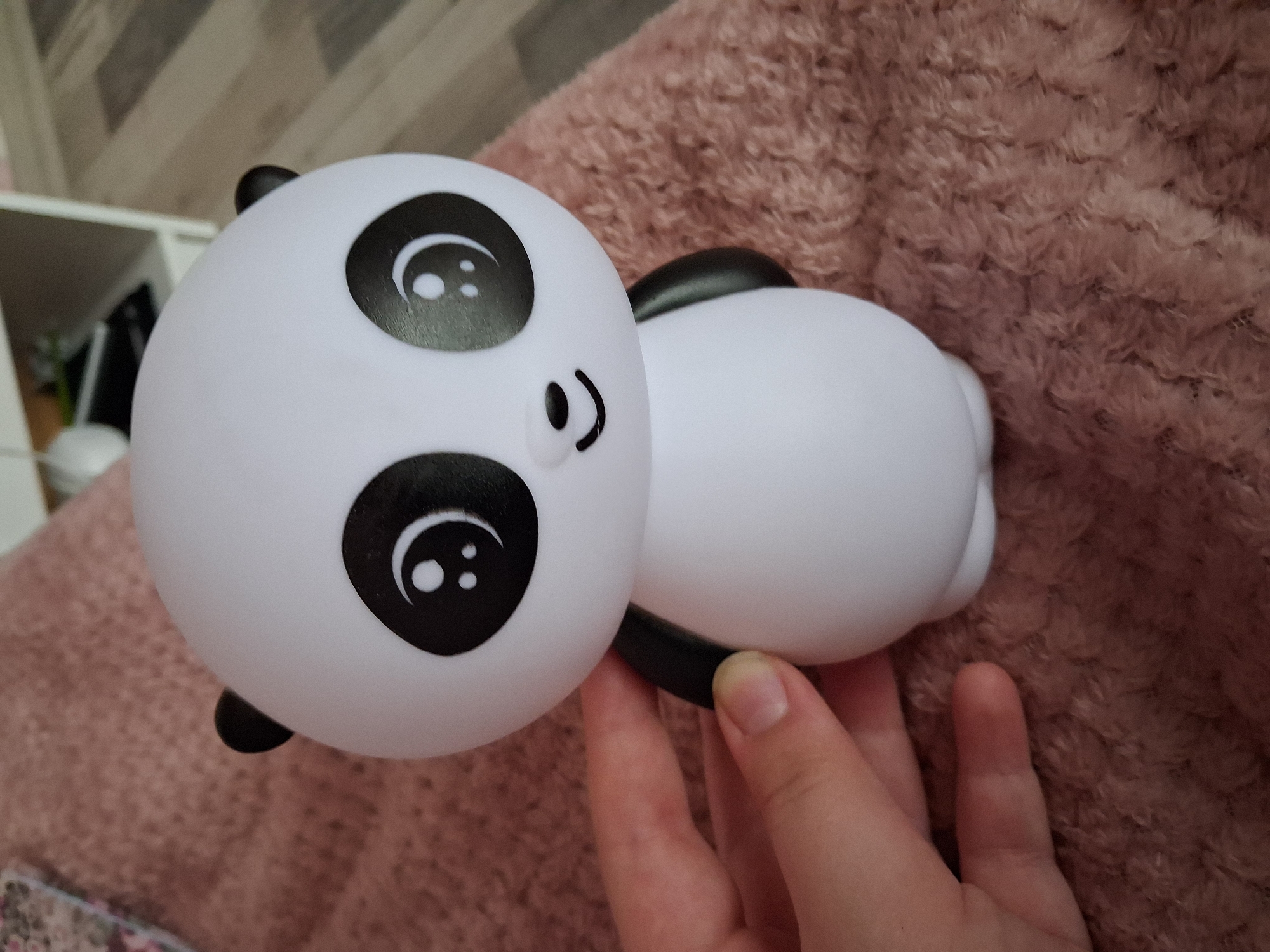 A white and black panda-shaped figure, approximately 15-20 cm tall, stands centrally on a textured, light brownish-pink fabric surface
