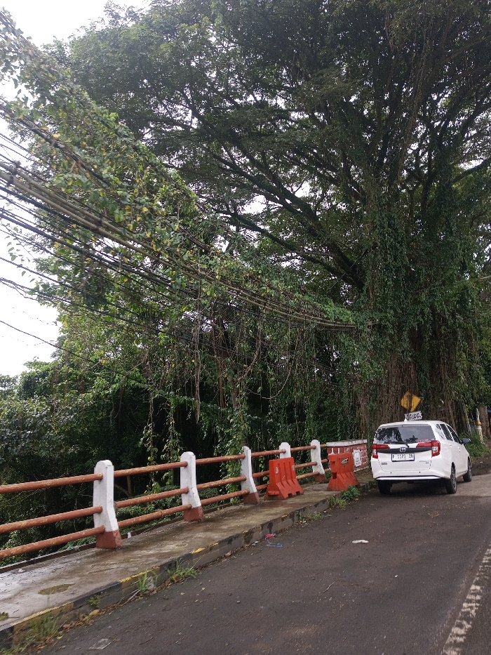 The scene depicts a section of a paved road with a concrete sidewalk and railing on the left, leading into a heavily vegetated area. The road surface is dark asphalt and appears slightly damp. On the left, a railing consisting of orange horizontal bars supported by white concrete posts separates the sidewalk from a lower, densely forested embankment. Several orange plastic traffic barriers are positioned on the sidewalk next to the railing. A white multi-purpose vehicle (MPV) or small SUV is parked facing away from the viewer on the right side of the road, adjacent to the dense vegetation. The vehicle's rear license plate displays 'F 1521 ZM'. Behind the vehicle, a yellow diamond-shaped road sign with a black arrow indicating a right-then-sharp-left turn is partially visible amidst the foliage. Dominating the right and background is a massive, mature tree with a broad canopy and numerous hanging aerial roots, indicative of a banyan-type tree. Its trunk and branches are heavily draped with vines and dense green foliage. A network of dark utility wires, some intertwined with vines, spans horizontally across the upper-left quadrant of the frame, originating from outside the view and extending towards the large tree. The sky above is overcast. No individuals are present. This scene is located in the city of Kodarapalli, India.