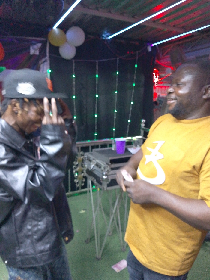 Two men stand indoors amid party decorations. One man, wearing a black cap and leather jacket, is partially obscured while holding up two fingers. The other man, in a yellow t-shirt with a large white symbol, smiles and holds a small object in his hands. Balloons and string lights adorn the background. A silver metal folding table supports a purple cup. The ground is green and littered with debris, including a scattered bill. The overhead lighting is colorful, with neon tubes casting light.