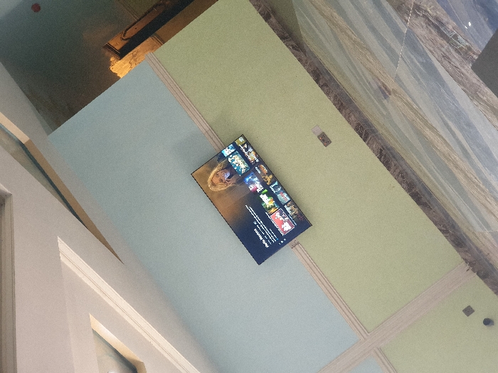 The image depicts an interior architectural space within an unknown location in Unknown, Unknown, captured from an upward, oblique angle. A black flat-screen television is mounted diagonally on a light blue wall surface, displaying a streaming service user interface. The screen prominently features a blonde woman smiling and holding a phone to her ear, surrounded by smaller content thumbnails. To the left of the television, a light green wall segment is visible, adorned with horizontal and vertical off-white decorative moldings, and containing a light brown electrical outlet near its lower edge. Further to the left, a vertical surface with a mottled grey and brown marble pattern is present, separated from the light green wall by a dark brown border. In the upper right quadrant, white architectural elements, including recessed paneling, form part of a ceiling structure. The lower right portion reveals a partial view into a darker adjacent area, showing a golden-hued archway or molding and a red circular wall-mounted device. No individuals are present within the scene.