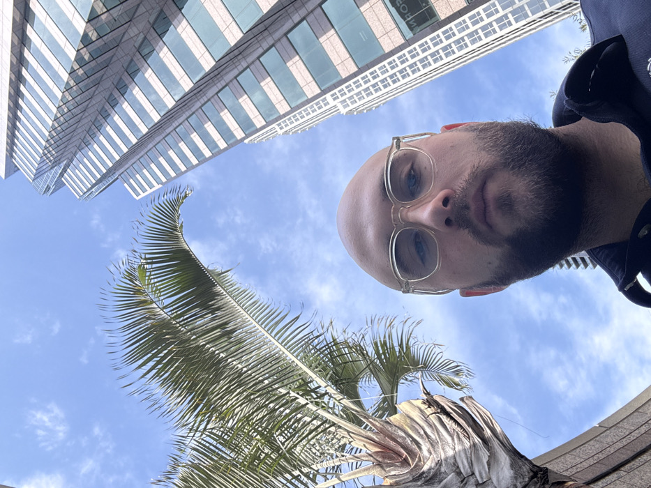 From a low-angle perspective, a bald man with glasses looks down at the camera. Behind him, a tall building rises into a blue sky with light clouds. A palm tree with its distinctive fronds spreads out against the sky, positioned between the man and the building.
