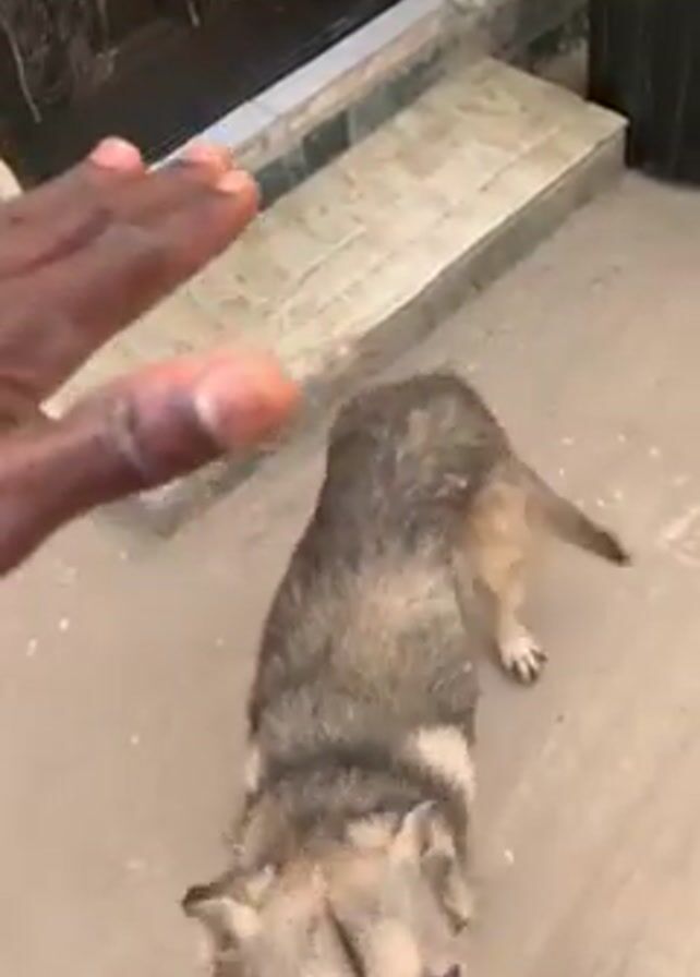 A person's hand waves at a medium-sized dog in front of a doorway with white stone steps. The dog is gray and tan, possibly a young German Shepherd mix. The person says, "Yes. Good morning." The person pets the dog briefly. The environment appears to be an outdoor patio or entry area with light-colored concrete flooring and a black pot or container in the background.
