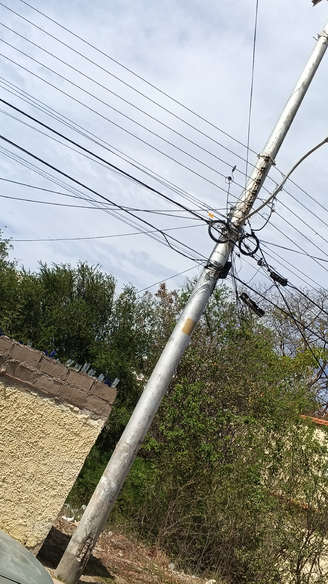 utility pole in Juan Griego, Venezuela. The pole is metal and has numerous wires and attachments, including black circular housings for equipment. The sky is visible in the background, with light clouds. Trees and vegetation surround the base of the pole. A wall topped with shards of glass, likely for security, is visible to the left of the pole. The ground appears dry with scattered debris.