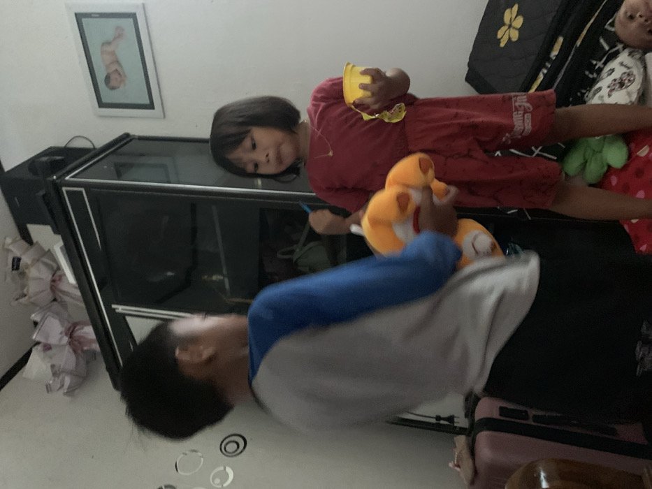 An indoor scene in a residence located in Kecamatan Pati, Indonesia, depicts three children and various household items. In the foreground, positioned centrally on the left, an adolescent boy is seen from the back and side, wearing a grey and blue long-sleeve shirt and black shorts. He holds an orange plush toy in both hands, facing a younger girl standing to his right. This girl has short, dark hair and wears a red t-shirt, a thin necklace, and red shorts. She holds a small blue object, possibly a toothbrush, in her right hand and a yellow plastic cup with a partially visible yellow wrapper or item inside in her left hand. Her expression suggests focus or slight pouting. In the bottom right corner, a portion of a third child's face is visible, lying on the floor, looking upwards. The background features a dark-colored cabinet with glass doors positioned against a white wall. On top of the cabinet are several bundled objects and a black electronic device. To the right of the cabinet, a framed picture of a baby lying prone is affixed to the white wall. White circular wall decals are visible on the left wall. The lower portion of the image displays a cluttered floor area, including a pink suitcase on the left, a black bag with a yellow floral pattern on the right, a green plush toy, and other unidentified objects resting on a red patterned blanket or rug.