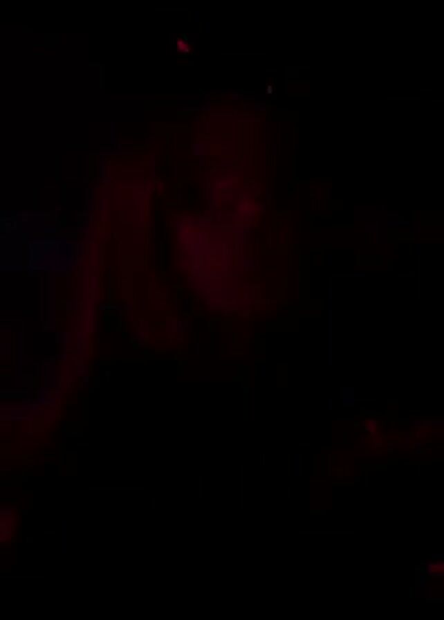 person in a dark environment, likely a club or event, with dynamic lighting changing between red, blue, and purple. The individual, wearing sunglasses, appears to be moving to the music. The lighting creates shadows and highlights that make the person's features intermittently visible. The overall atmosphere suggests a nightlife or entertainment setting with music and dynamic visual effects.