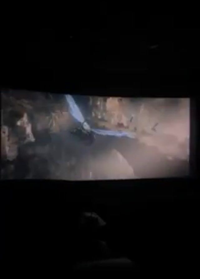 movie theater screen displaying a scene from a fantasy film. The scene depicts a mountainous landscape with flying creatures resembling large birds with blue and white feathers. The creatures are soaring through a canyon or valley with rock formations and mist. The theater is dark, and the person filming is sitting in a seat, with the back of the seat visible in the foreground.