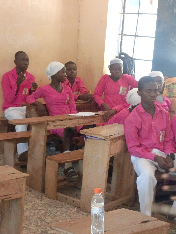 The image displays a classroom scene in Mada, Nigeria, featuring approximately eight young individuals, presumed students, seated at wooden desks and benches