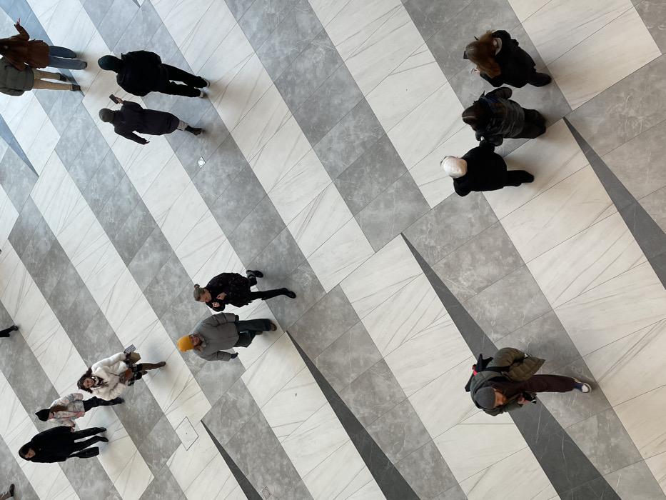 The image, captured from a high-angle perspective, depicts an interior public space within the city of Saint Petersburg, Russia. The floor features a geometric pattern of alternating diagonal stripes composed of light grey/white and darker grey marble-textured tiles, interspersed with dark grey triangular inserts. Twelve individuals are present, all dressed in cold-weather attire, including various coats, puffer jackets, beanies, and boots. Most are in various stages of locomotion across the tiled surface. In the upper-left quadrant, a group of four individuals proceeds from left to right. This group includes a woman in a black coat holding hands with a child in a white patterned puffer jacket, followed by a woman in a white fur-collared coat carrying a small bag. In the mid-left, two individuals walk side-by-side from left to right: one in a grey puffer jacket and a yellow beanie, alongside another in a black patterned jacket and black boots. Towards the mid-right, two individuals walk away from the camera's perspective; one wears a dark coat and holds a smartphone, while the other wears a black hooded jacket. In the upper-right, two additional individuals walk away from the camera, one in a light puffer jacket and the other in a brown jacket. At the bottom-left, a solitary individual in a khaki puffer jacket, dark pants, and a grey beanie walks from left to right, looking downwards, potentially at a handheld device. In the bottom-right, a group of three stands or moves slowly, facing away from the camera. This group consists of a person with light hair in a black coat, another in a dark puffer jacket, and a third in a black coat holding a smartphone. The environment is brightly and evenly lit, suggesting artificial illumination typical of a modern building's interior. Small metal floor vents are visible within the tile pattern. The scene captures routine pedestrian movement in what appears to be a commercial or large public building.