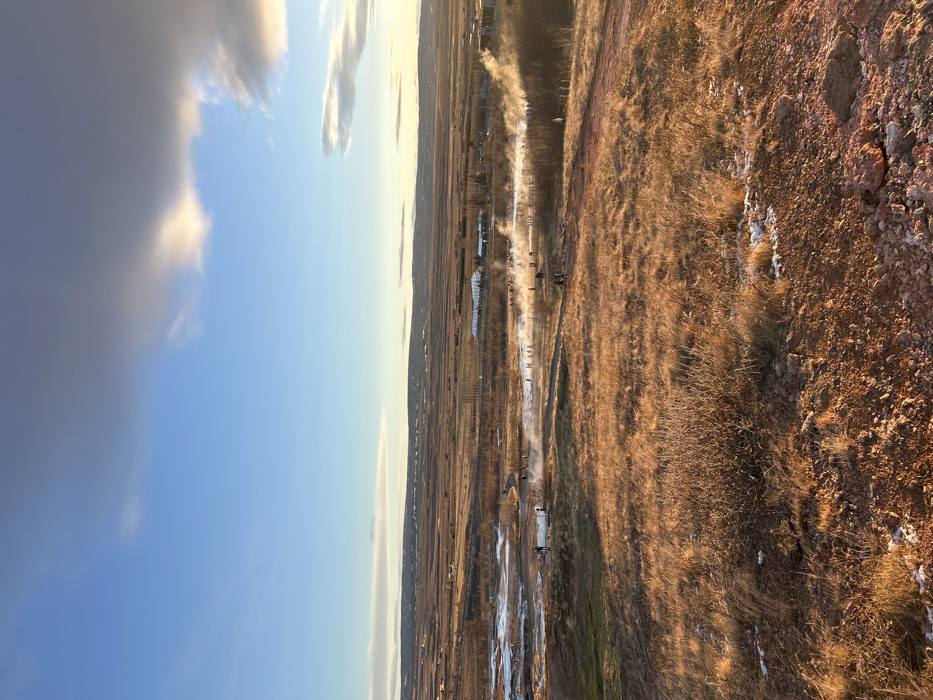 An elevated, wide-angle view depicts the Geysir Geothermal Area in Haukadalur, Iceland, under a partially cloudy sky illuminated by low sunlight. The upper third of the image features a clear blue sky on the left, transitioning to grey and white clouds on the right. The foreground consists of reddish-brown soil, dry golden-brown grass, and sparse, low-lying vegetation, with small, scattered patches of snow visible. The midground is dominated by the active geothermal field. Multiple irregular-shaped water pools are present, some appearing as open water, others actively emitting substantial white steam plumes. A prominent, elongated pool on the right is generating a large volume of steam, around which numerous individuals are congregated. Approximately 30 to 50 people, appearing as small, dark figures, are distributed across the area, primarily along visible pathways, observing the geothermal features. Sparse, bare shrubs and small trees line parts of the field, particularly towards the right. The background presents a vast, flat landscape of brown and green fields, extending to the horizon. Scattered buildings and structures are discernible in the far distance, with low hills visible on the horizon line. The scene is lit by warm, golden-hour light originating from the left, illuminating the foreground and portions of the geothermal field, emphasizing the dry vegetation's golden hues.
