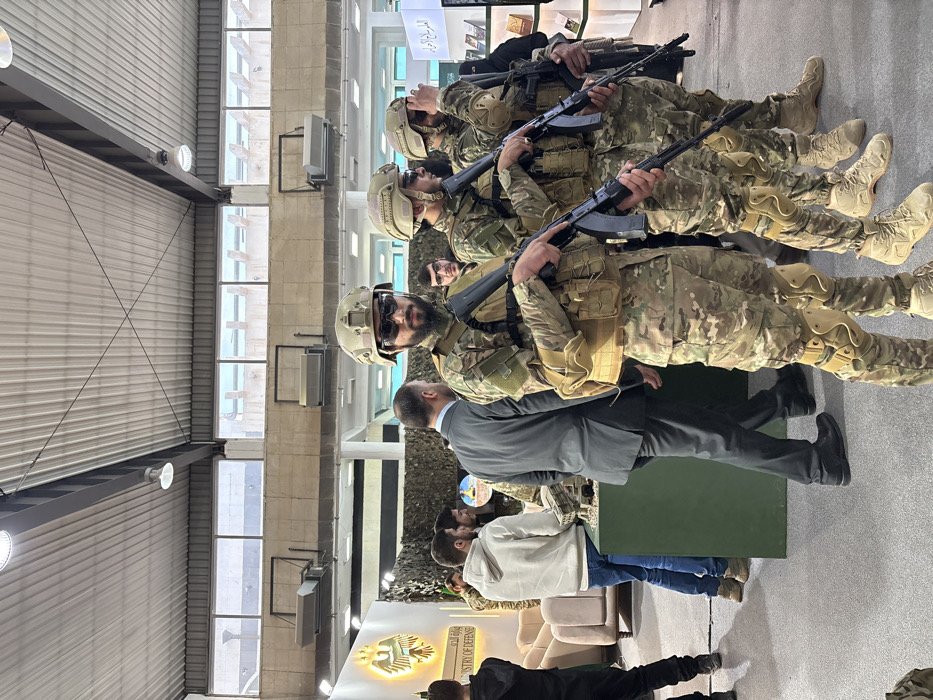 The image portrays an indoor exhibition hall in Shab'a, Syria