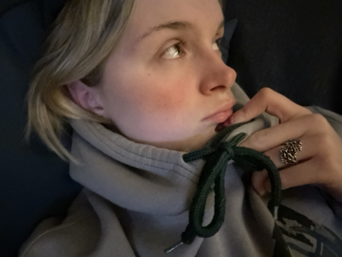 A fair-skinned person with blonde hair is shown from the chest up. The person is wearing a grey hooded sweatshirt. The hood's drawstring is dark green and tied. The person's right hand is visible, with a finger slightly touching their lip. A detailed, ornate silver ring adorns their finger. The person is looking off to the right of the frame. Their cheeks are flushed pink.