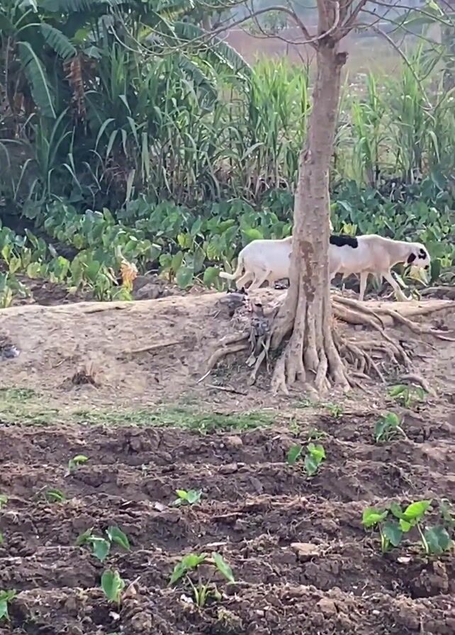 Two goats are standing next to a tree on a small mound of dirt. One goat is white and the other is white with black spots. They appear to be interacting. In the foreground, there is a tilled field with small green plants growing. In the background, there are various plants and a tree. After a moment, the goats move away from the tree.
