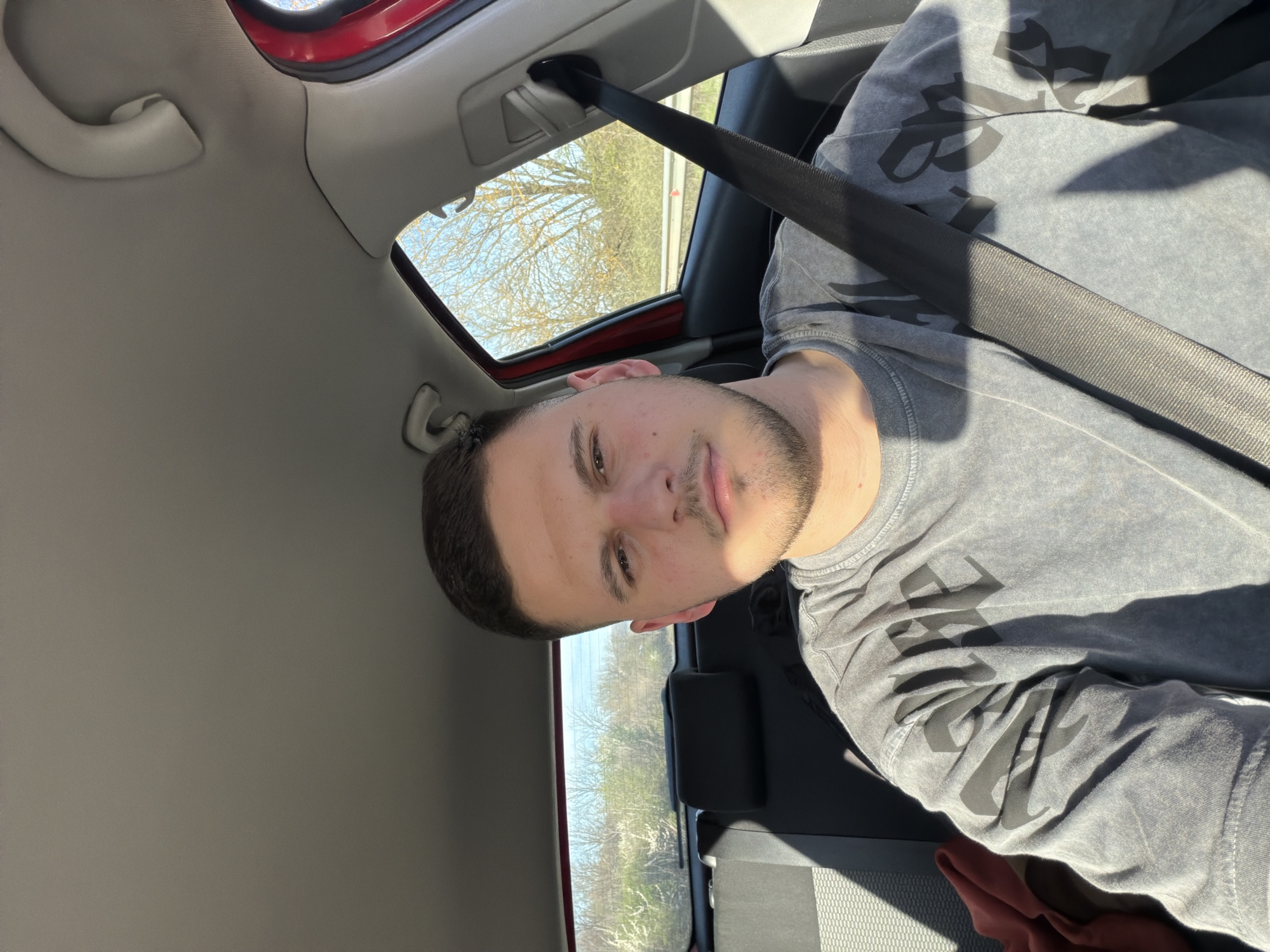 A young man is shown from the chest up, seated in the driver’s seat of a car. He is wearing a gray long-sleeved shirt with black lettering, and a seatbelt is across his chest. The car's interior is gray, and a sunroof is visible above him. The background seen through the sunroof and side windows appears to be a wooded area with bare trees. The location is not discernible.