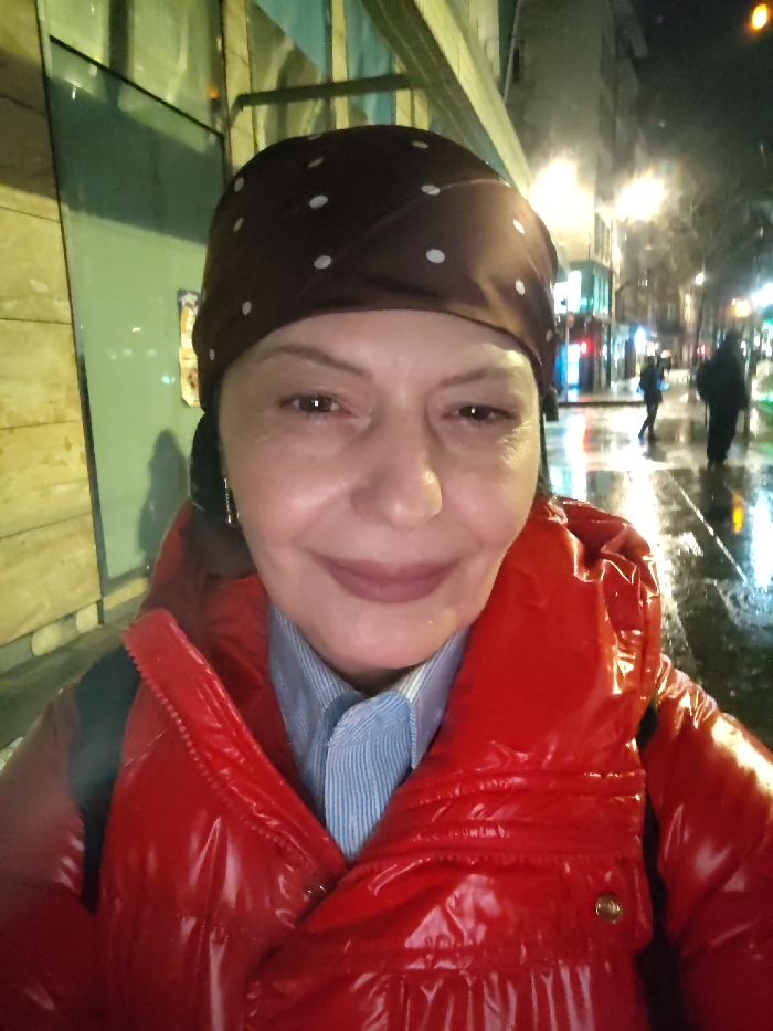 A woman in a shiny red puffer jacket and brown polka dot headscarf smiles at the camera. She wears a light blue striped shirt. The background shows a wet city street at night with blurred figures walking and streetlights reflecting off the slick pavement. A building is partially visible to the left.