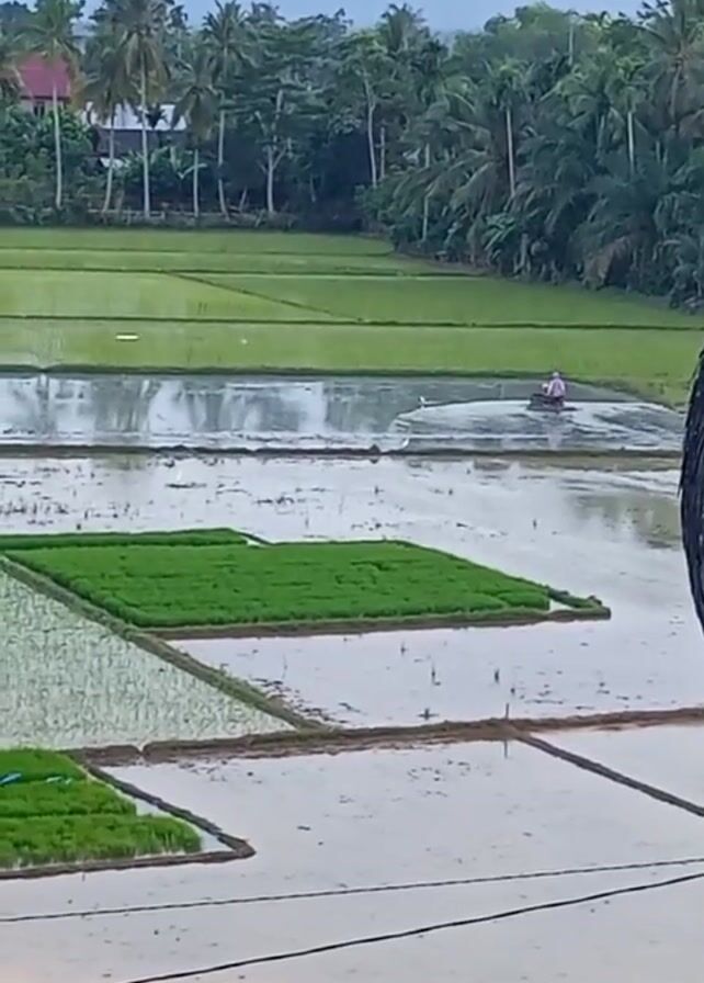 The camera films a panoramic view of a flooded rice paddy field. Various plots of land within the rice paddy are visible, with some already planted with young, green rice plants. In the distance, a person wearing a pink top appears to be moving through the flooded field, their actions not clearly distinguishable. Several white birds dot the landscape, moving around in the water. In the background, lush green trees, including palm trees, form a dense forest. A house is barely visible between the trees in the far left corner of the view. The sky is overcast. In the foreground, a partial view of a building and its rooftop is visible.
