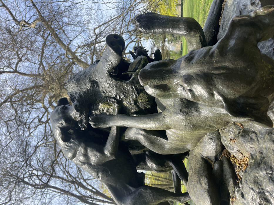 A dark bronze sculpture titled "La Curée" by Emmanuel Frémiet is depicted outdoors in the Parc de la Mairie in Saint-Rémy-lès-Chevreuse, France
