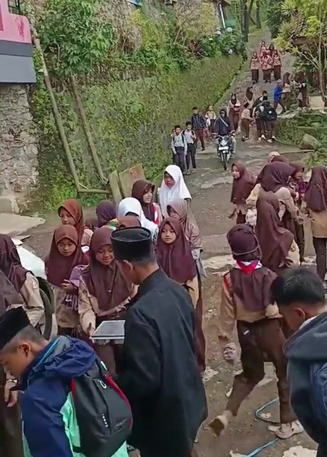 A group of school children and adults are gathered on a sloped path in a hilly area. Most of the girls wear brown uniforms and hijabs, while some wear white hijabs. A few boys are present, some wearing backpacks and traditional hats. An adult in a black shirt and hat is distributing clipboards to some of the children. Other children walk up the path toward the camera. The path is lined with stone walls and vegetation, and buildings are visible on the hillside. A motorcycle is parked along the path. The overall atmosphere seems to be one of preparation or gathering before an activity.