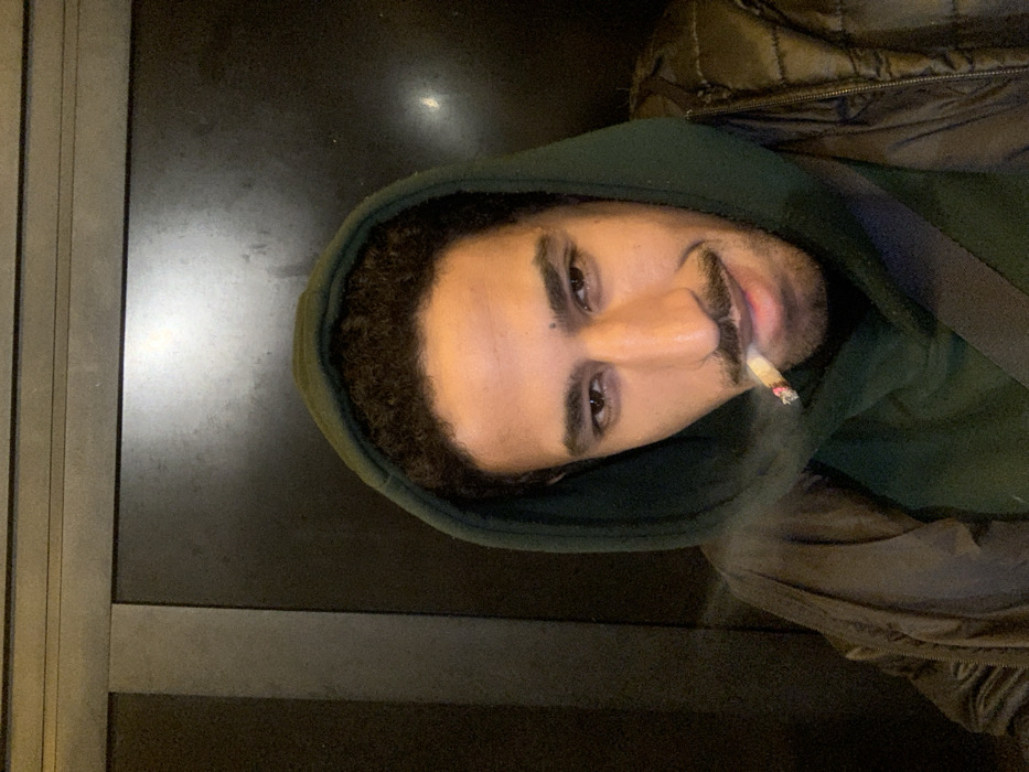 A person wearing a dark green hoodie and a dark jacket is smoking a cigarette. The individual's face is visible, and they have short curly hair, a mustache, and a slight smile. Smoke is visible around the cigarette. The background is a dark, slightly reflective surface, possibly a wall or a door. The image is rotated slightly, giving a tilted perspective of the subject.