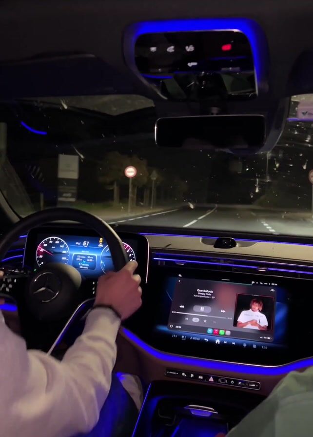 Here's a plain text description of the video: The video shows the interior of a car, likely a Mercedes-Benz, at night. The car's dashboard and interior are lit with blue ambient lighting. The driver is visible holding the steering wheel. The passenger is holding a phone, seemingly recording. The car's infotainment screen is playing music with the artist's image visible. The car is moving on a street at night.
