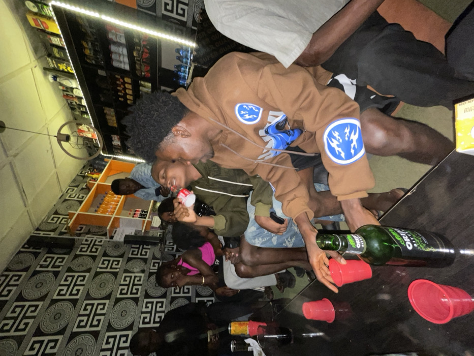 Several people are gathered around a table in a room that appears to be a bar. The table is littered with red plastic cups and at least one empty green bottle. One person wears a brown hoodie with blue patches. Some individuals are seated while others are standing or leaning on the table. The backdrop includes shelves stocked with bottles and a patterned wall. The lighting in the room is bright, with a strip of lights along the top of a shelf.