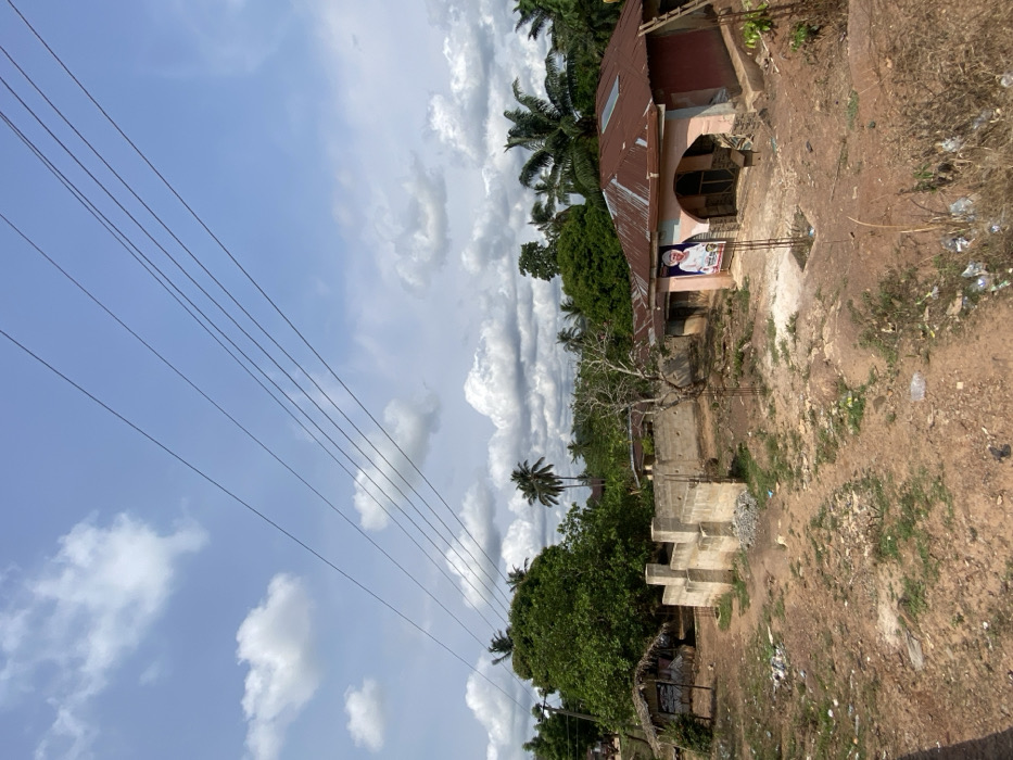 A rural landscape features a dwelling with a rusted roof and a poster of a bearded man. Power lines stretch across a sky dotted with cumulus clouds. A tropical tree towers over a concrete structure partially hidden by verdant foliage. Earthy terrain slopes downward, littered with debris. The composition offers a glimpse into a simple village life beneath a bright sky.