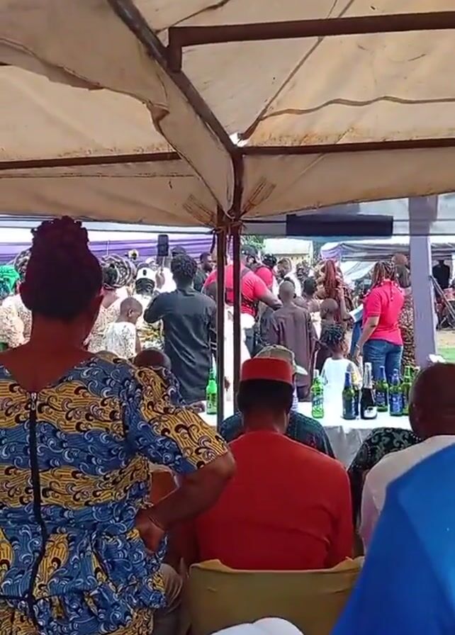 crowd of people gathered under a tent, likely at an event. The camera is positioned behind a row of seated individuals, offering a view of the activity taking place further ahead. A man in a black shirt can be seen holding a phone, possibly recording or taking pictures of the scene. Several other people are milling around, some dressed in traditional attire. There are also men in red shirts who appear to be acting as security. A table in front of the seated individuals is laden with drinks, including beer and champagne. The setting suggests a festive or celebratory occasion, possibly a wedding or a similar social gathering.