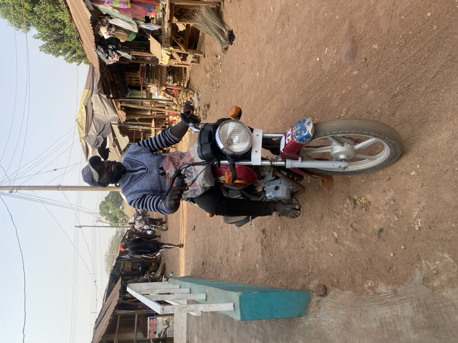 A man on a motorcycle smiles towards the camera. He wears a blue cap, a patterned blue and white shirt, black pants, and sandals. The motorcycle is red with a silver headlight and a blue, white, and red design on the front fender. The background includes a dirt road, buildings with cluttered storefronts, and other people further down the road. A small turquoise structure is in the foreground.