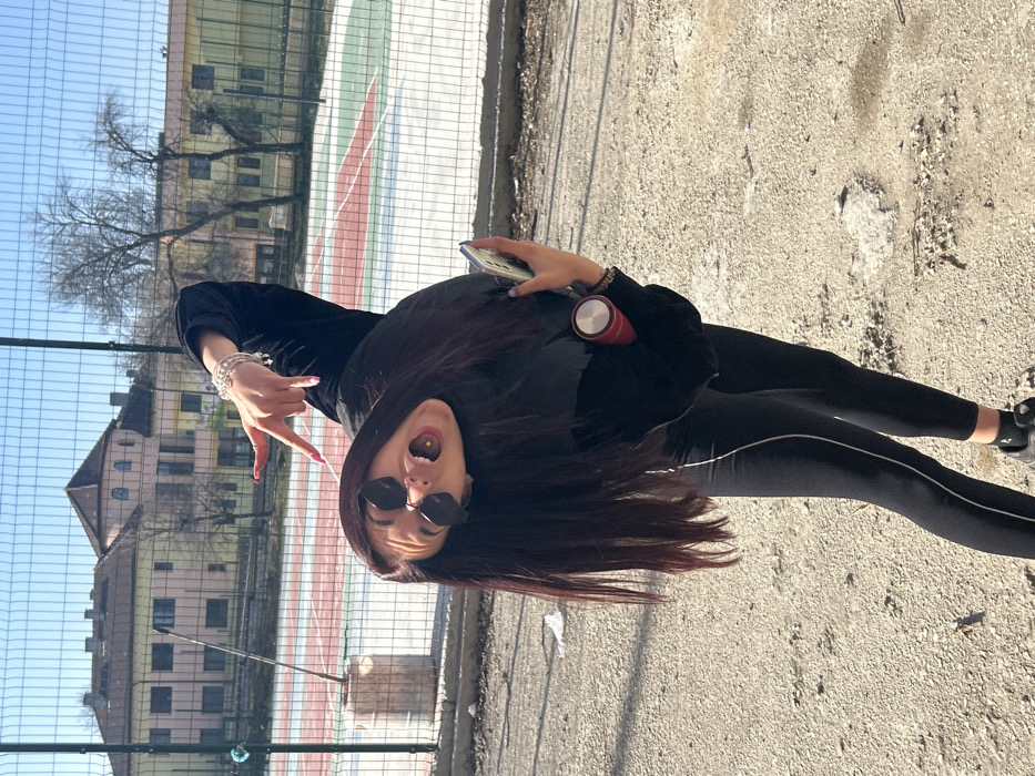 The image depicts an outdoor scene in Cherven Bryag, Bulgaria, on a clear, sunny day. A young female, positioned in the foreground, is the primary subject. She has long, dark hair, wears dark sunglasses, a black long-sleeved top, black leggings with white side stripes, and dark athletic shoes. Her torso is bent and twisted to her left, with her head tilted sharply. Her mouth is open, revealing teeth and a light-colored tongue piercing. Her right arm is raised, with the hand displaying a "rock on" gesture, featuring multiple silver-colored bracelets and pink nail polish. Her left hand holds a smartphone vertically, and a red thermal mug or bottle is visible tucked under her left arm. The ground beneath her is uneven, composed of light-colored dirt and gravel. Behind the subject, a dark wire mesh fence separates the foreground from a sports court. The court features red and green painted sections with white boundary lines, indicative of a tennis or multi-sport facility. To the left of the court, a light-colored bucket containing a thin metal pole or stick stands near the fence. In the background, under a clear blue sky, are several bare deciduous trees and two prominent multi-story buildings. The building on the left is pale orange/peach-colored with a reddish-brown tiled roof and a distinctive rounded turret-like feature on its right facade. To its right, another building appears light yellow with a darker roof.